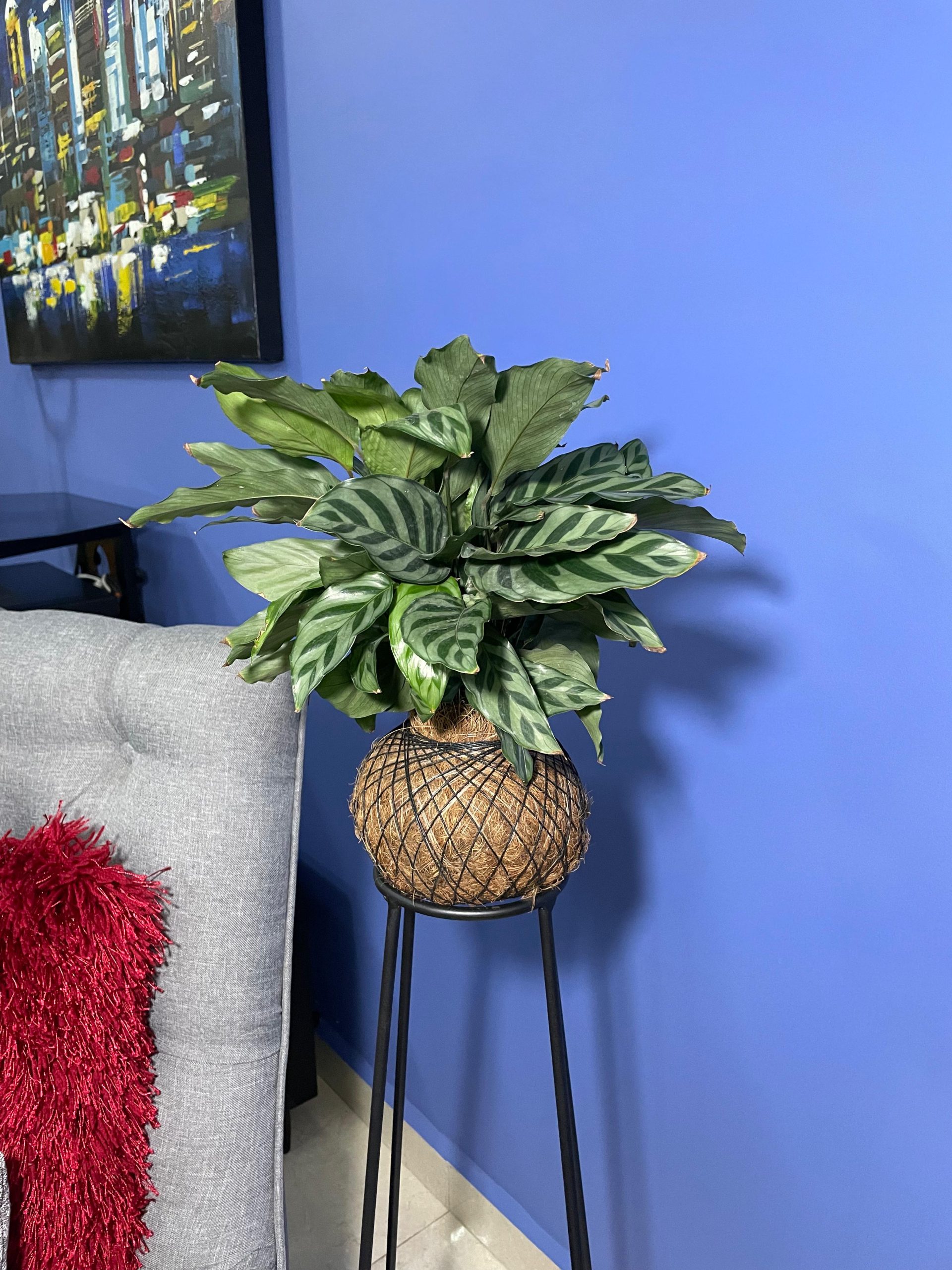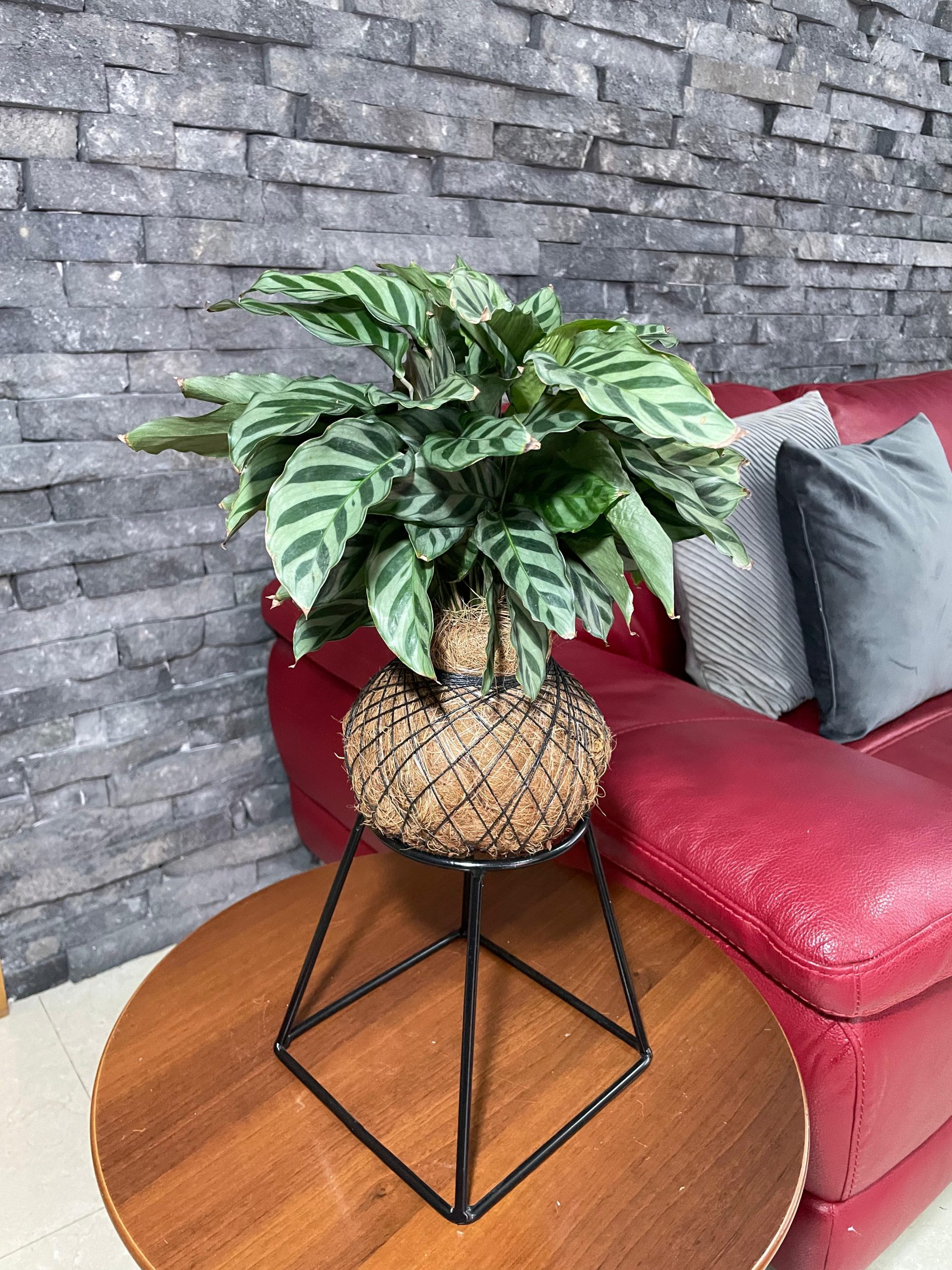 La Calathea Freddy es la definición de elegancia sutil. Sus hojas alargadas presumen un patrón de rayas en verde oscuro sobre un fondo verde plateado, creando un efecto refinado y lleno de frescura. Es una Kokedama que aporta un toque de diseño y serenidad, perfecta para espacios que necesitan un detalle de vida sin estridencias.