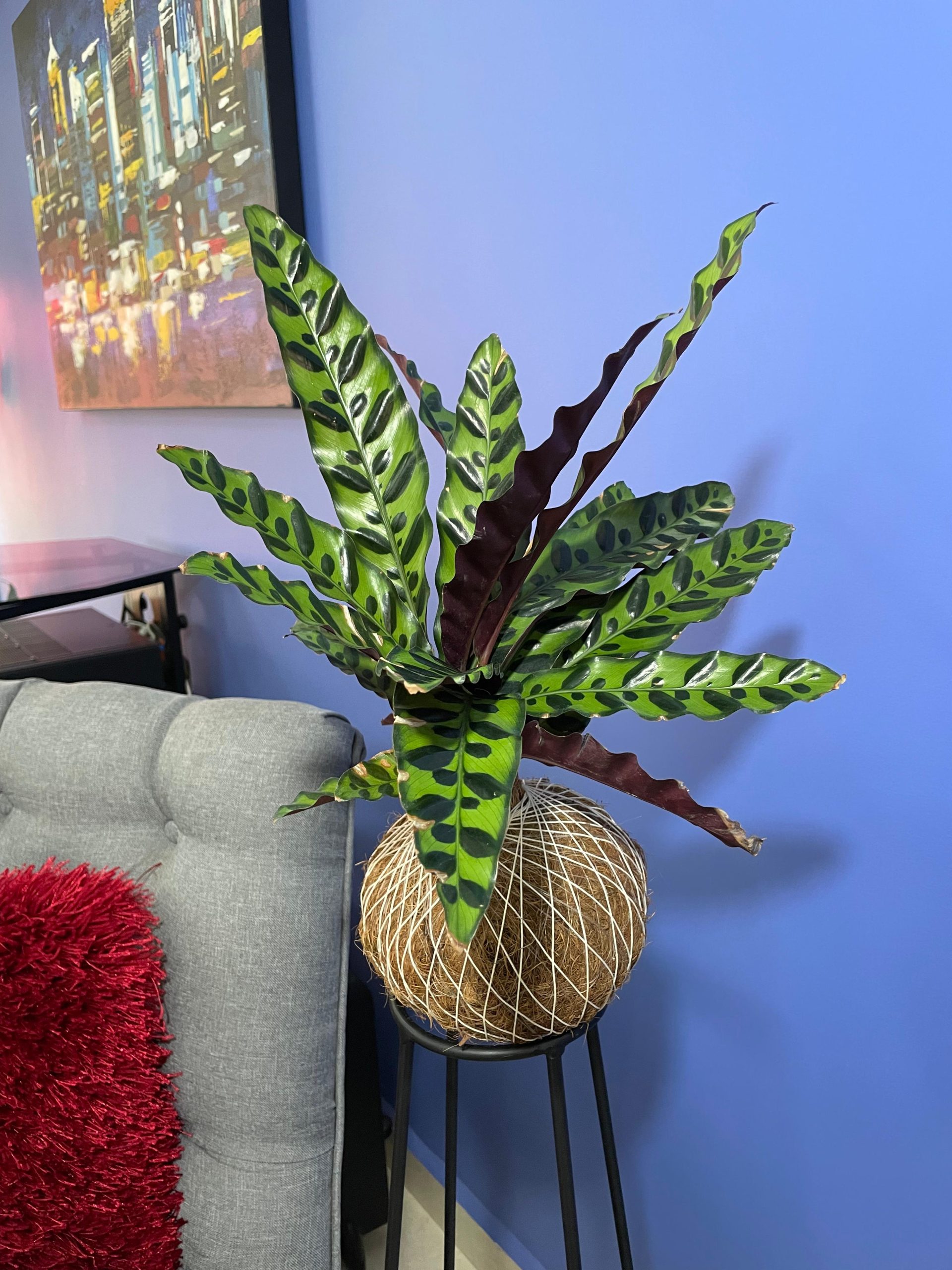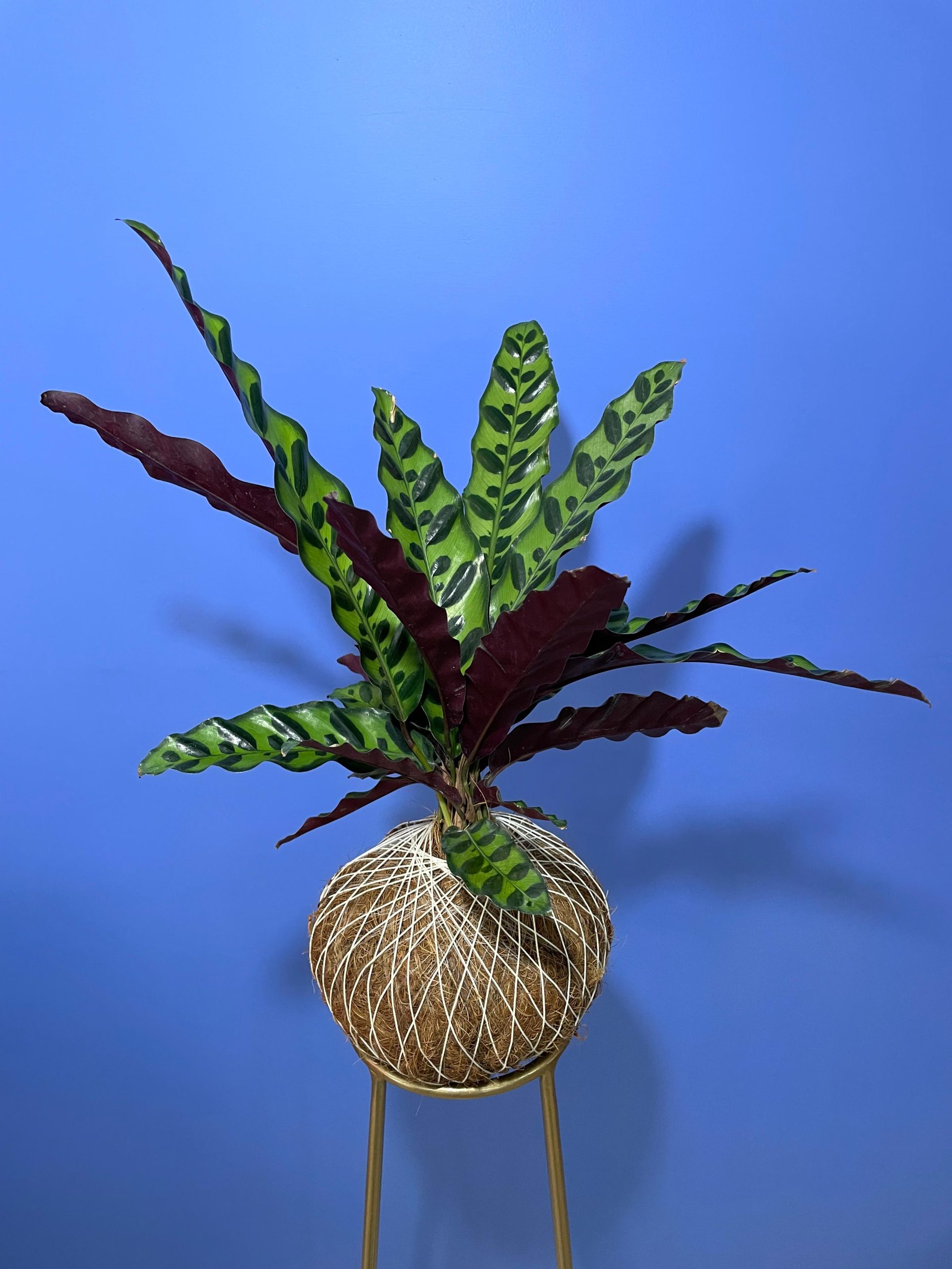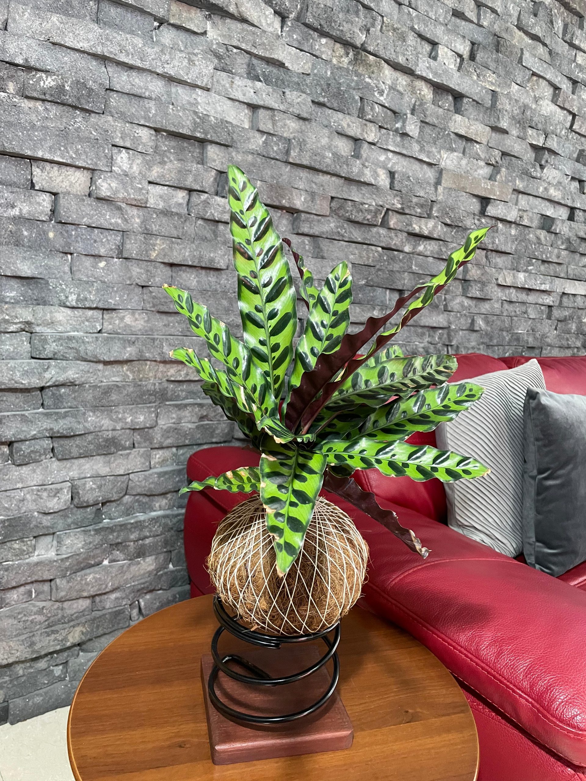 La Calathea Lancifolia es una verdadera obra de arte, con elegantes hojas que parecen pintadas a mano con patrones vibrantes y un sorprendente reverso púrpura. Es una Kokedama que no solo decora, sino que vive y se mueve contigo, hipnotizando con su belleza.