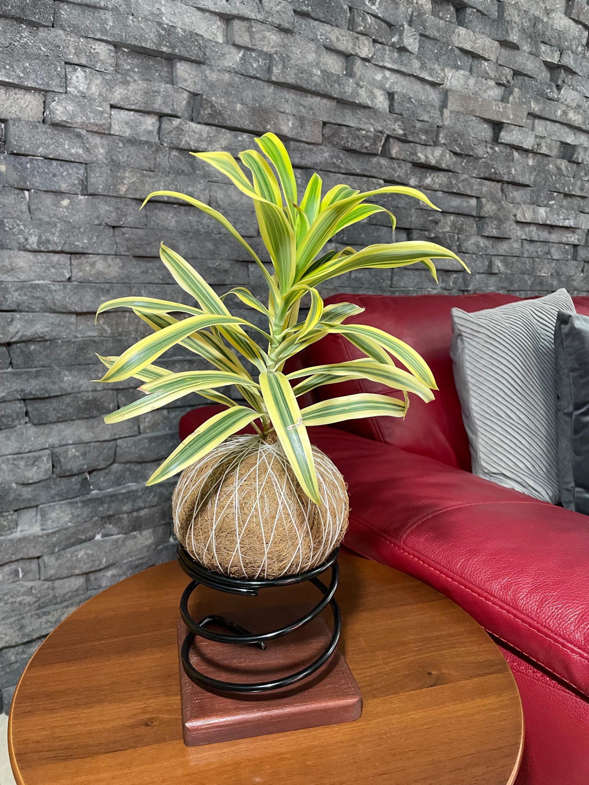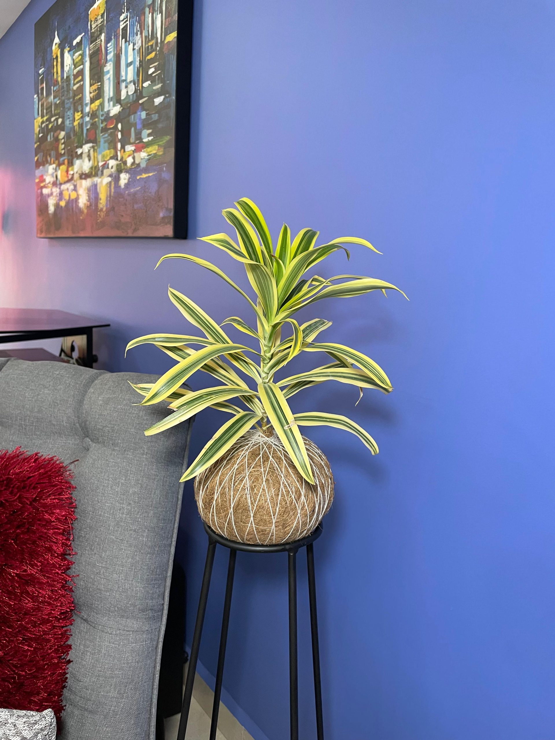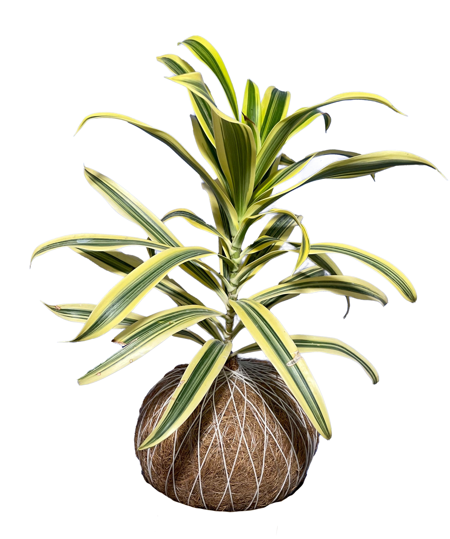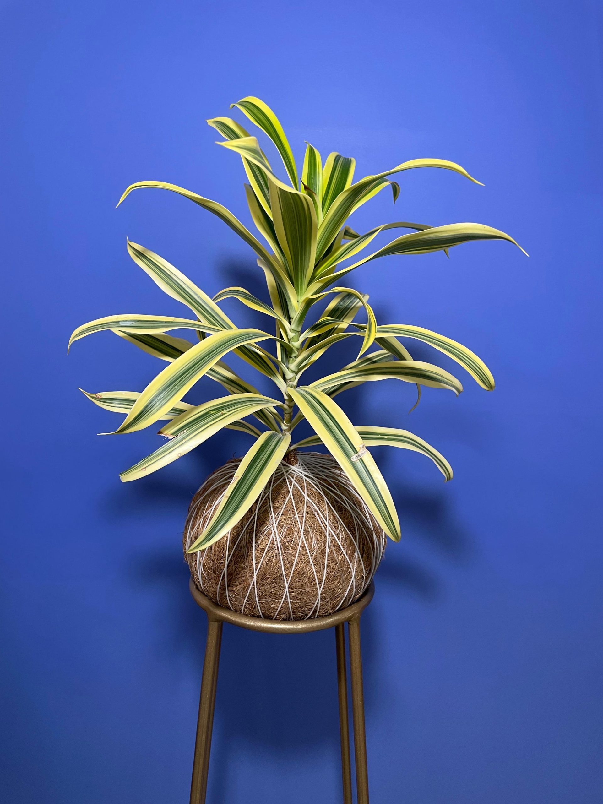 Sus hojas lanceoladas, dispuestas en una elegante espiral, son un espectáculo de franjas verdes y amarillo-limón que parecen irradiar luz propia. Es una Kokedama que aporta una dosis de alegría tropical y un estilo desenfadado y optimista a cualquier espacio.